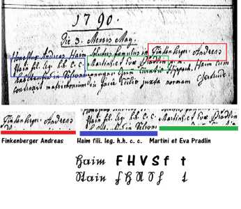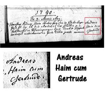 Andreas Heim, hijo de Martin y Eva con Gertrud Höllwart, hija de Johann Höllwart y Walpurga Wechselberger. Los datos de la esposa se anotan en la hoja siguiente, que recibe el número 50 en lugar de 40. Honestus Andreas Haim solutus famulus in Finkenberger stain fil. leg. h.h.c.c. Martini et Eva Pradlin p.m. Es la lectura correcta del documento. Incorrecto sería el apellido de la madre del novio, que todo indica que es Tipotsch. |